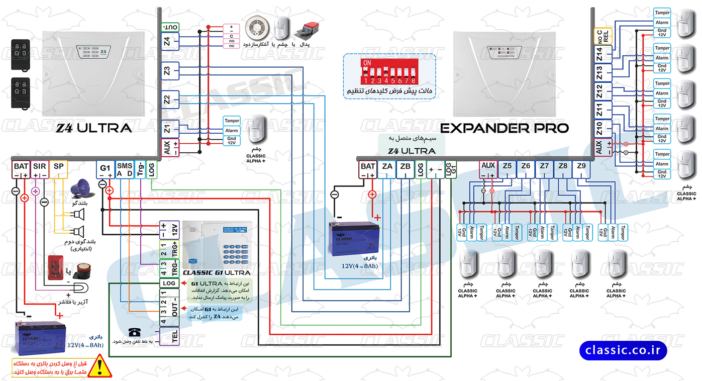 نقشه سیمبندی سیستم حفاظتی کلاسیک، بدون استفاده از Z4 Ultra: در این حالت Expander Pro در نقش دستگاه مرکزی است و سیستم 10 زون دارد.